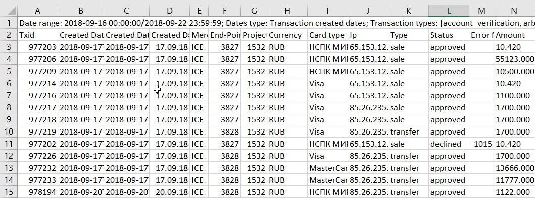 This report contains the list of transactions for the specified time period. To download the necessary data, the following criteria are used: dates, date type, transaction types, change status, card types, transaction id, recurrent filter, time zone, CSV encoding. This report can also be downloaded by API for automated reconciliation or analysis: Remote transactions report. Additional criteria can be added by pressing the Criteria button: order status, currency, endpoints, projects.